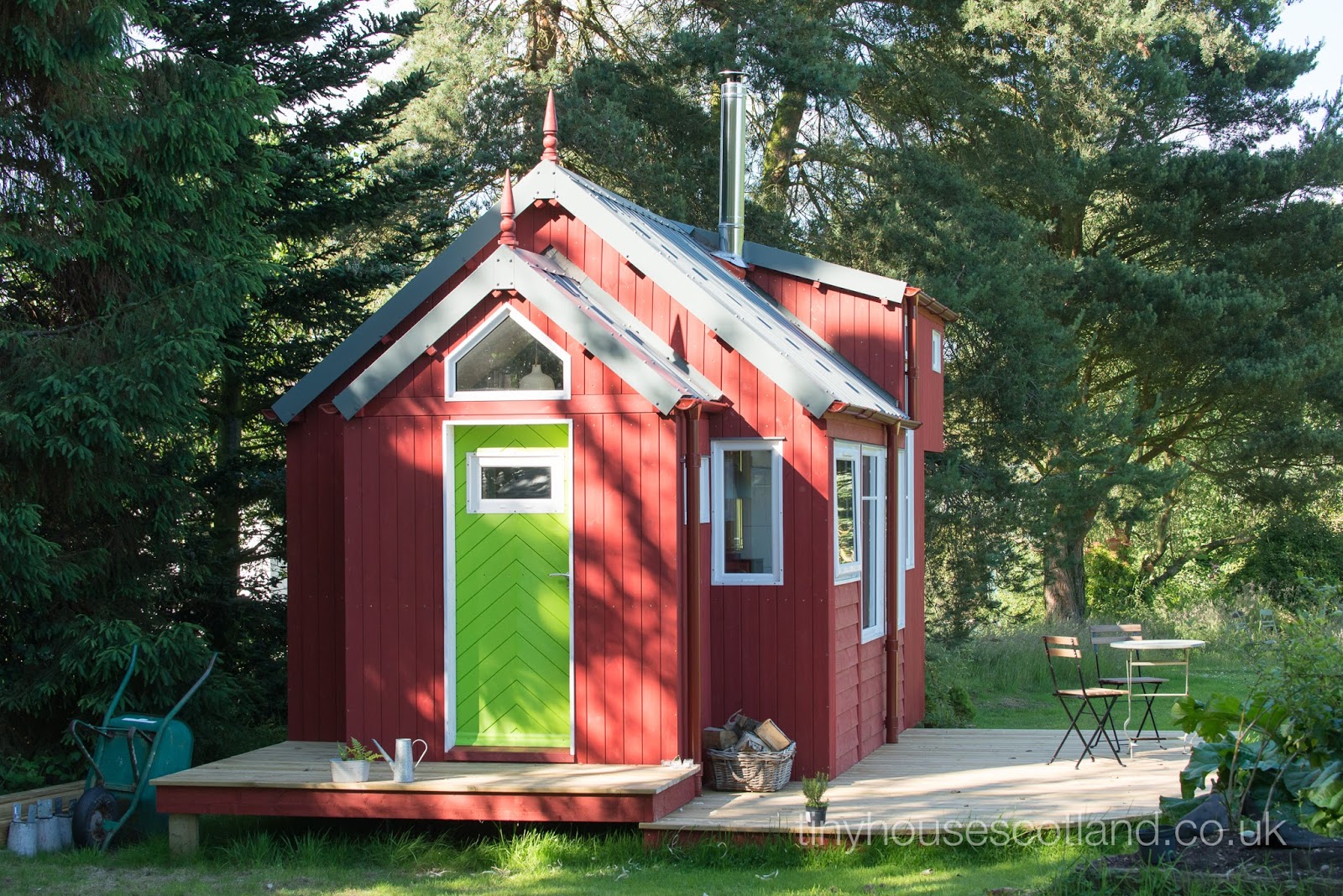 Ngôi nhà gỗ nhỏ nổi bật giữa thiên nhiên bao la cây cỏ nhờ màu sơn đỏ đẹp mắt.