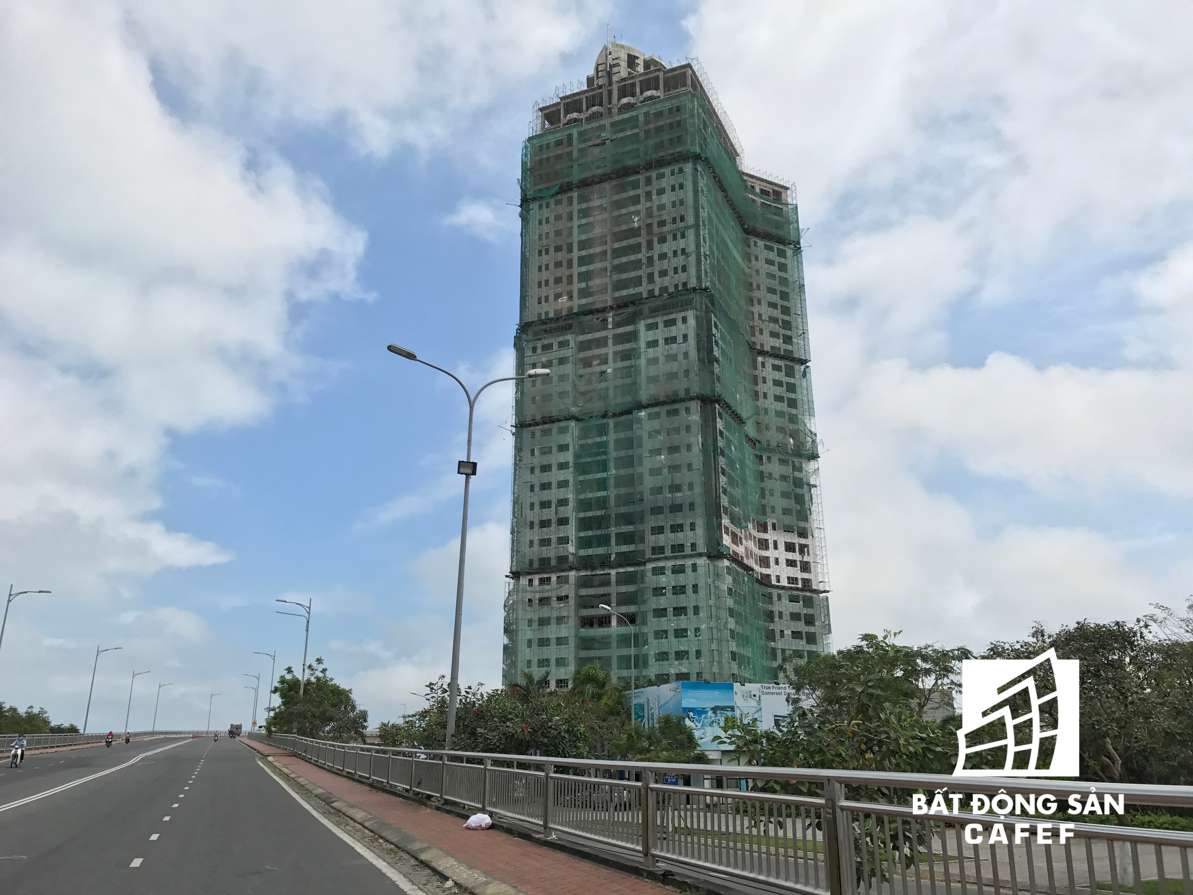 Một trong 4 dự án tổ hợp căn hộ của Novaland nằm gần cầu Thuận Phước đang gấp rút thi công.