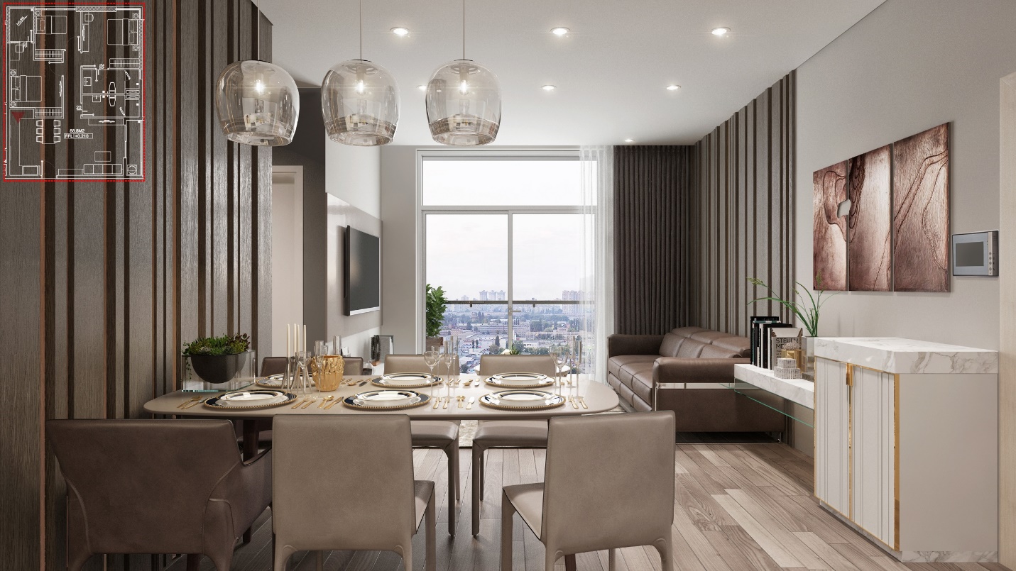 Nội thất căn hộ được bài trí theo phong cách hiện đại, tối ưu diện tích và công năng, bên cạnh sử dụng màu bạch kim nhẹ nhàng và màu nâu trầm của gỗ mang lại không gian sống sang trọng, nhẹ nhàng và ấm áp.